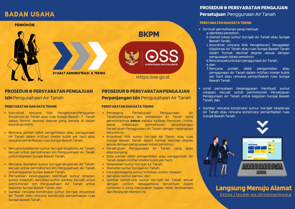 Pengurusan penataan izin pengusahaan air tanah atau persetujuan penggunaan air tanah, persetujuan pengeboran sumur imbuhan-persetujuan pengeboran sumur pantau-persetujuan alih fungsi sumur imbuhan-persetujuan alih fungsi sumur pantau-registrasi sumur imbuhan-registrasi sumur pantau-izin air tanah dan air permukaan-izin sda-rekomtek-studi-kelayakan-persetujuan-pengeboran-eksplorasi