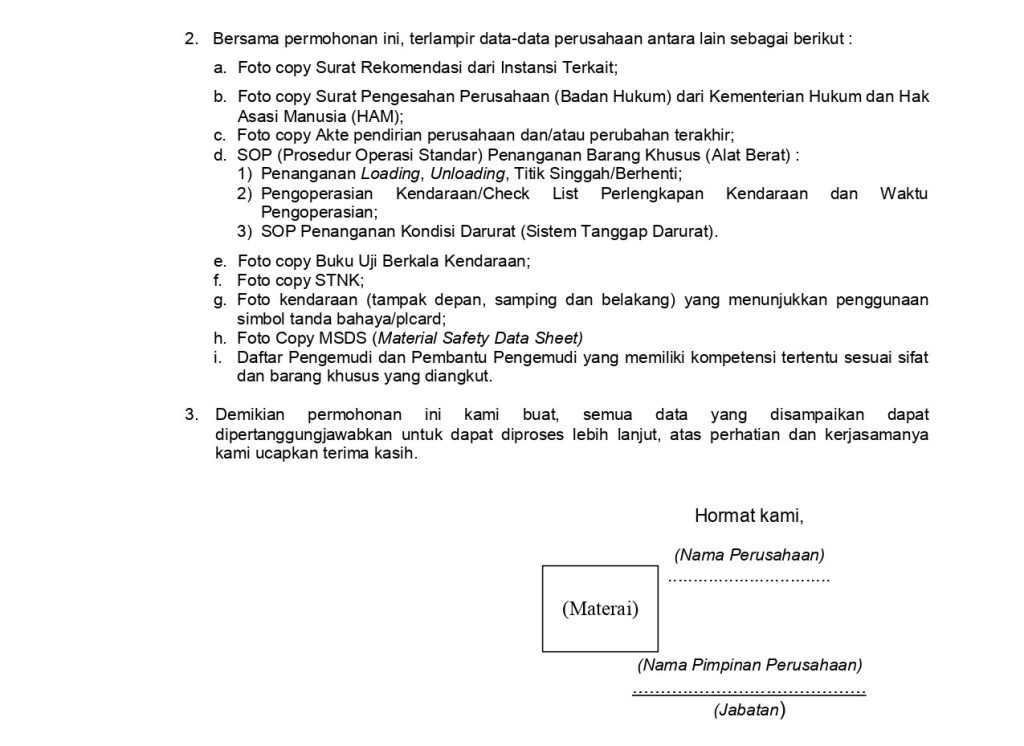 - Copy Rekomendasi dari KLH atau ESDM (tidak di lampirkan untuk Izin Angkutan Alat Berat)